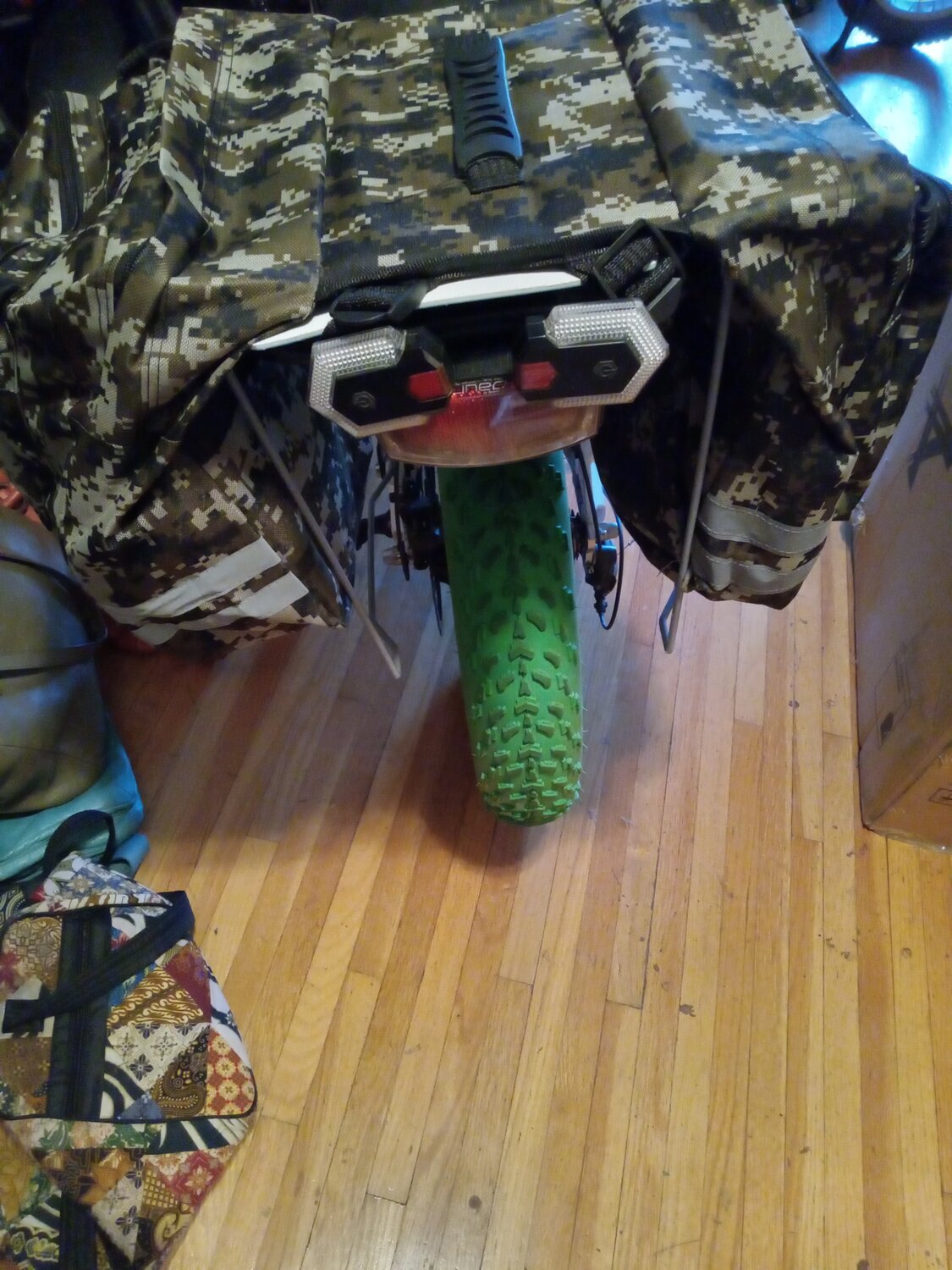 🌬️ Been riding around in storms. The kind where you can't look beyond 6 feet (but that's stretching it - more like 2 feet, but that sounds too unsafe to admit to). Today is pretty stormy. The weight of the bike is not enough to make it safe to ride next to traffic. Luckily, my sack of potatoes helped. The flat of eggs made it. So next upgrade to the Liberty is to explore options for frame-less bike saddlebag system? Lesson learned. Another thing to look at when shopping for a bike is to dig into just how a set of saddle bags is going to fit, exactly? This is likely more important for people using bikes to replace a gas vehicle. I chose based on hilly terrain capabilities mainly. The new camo saddlebags that just came in today, rub against the rear wheel and in that case there will be wear in the bags in no time. A pannier rack system? Will look up if there is such a one. Unfortunately, my handy thermometer blew off today. Fortunately, I heard it hit the street and it is a side street, so no damage. That little thing is great. Even during a wet storm it reads 99% percent moisture/rain. I like that 1% left to chance of change. I can't verify the temp. read-out here, but I am satisfied that it is correct - give or take one degree.