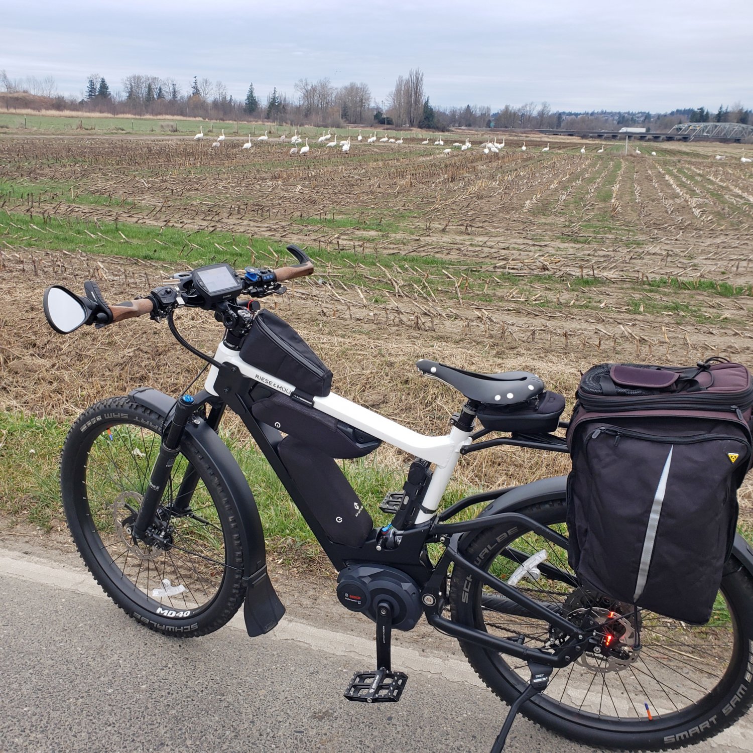 Yesterday I put Schwalbe Smart Sams, a new chain, front sprocket and 11&13 tooth cogs on the rear cassette on the Delight Mountain. I then went for a 50 mile ride out through the farmland surrounding Bellingham in rather chilly weather (36 degrees). The skies were full of migratory water birds including hundreds of Trumpeter Swans. It was a glorious, invigorating ride.