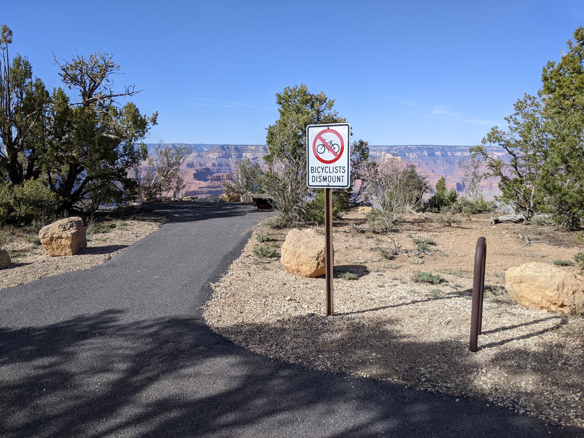 Along the Hermits Rest route, there is a greenway/shared path along part of the route. There's no way a bike can run on the pedestrian-only trail that runs along the lip of the canyon. You'd be insane to even try it at analog speeds. Here in the USA we often decry the fact we have a society that wants to bubble-wrap us. Well... not at GCNP. Park benches are right at the freaking lip. And if you stumble off the trail... Sayonara. I have friends who live in the area and they say they see local news stories all the time of dumbasses who screw up and go into the Canyon. Here's an example. This is *exactly* what it looks like: A runway straight to the edge (note the bench to sit on at the right side). With a helpful bit of advice on not riding your way to that bench. I kid you not it is straight f**king down just past those stones at the end of the pavement.