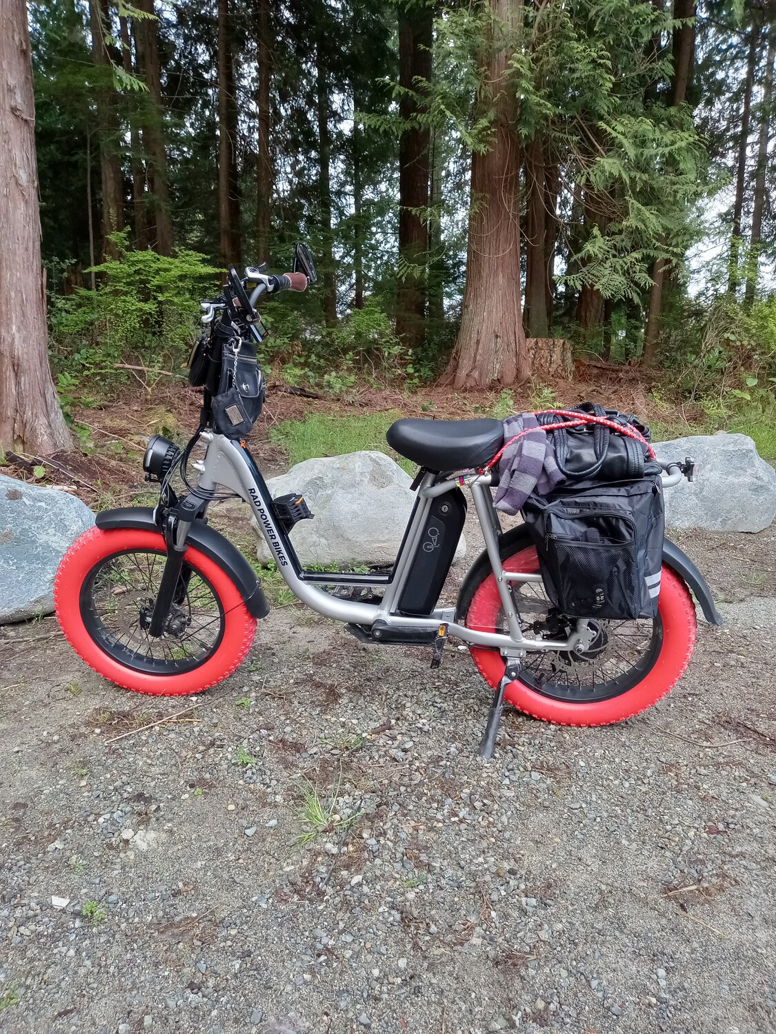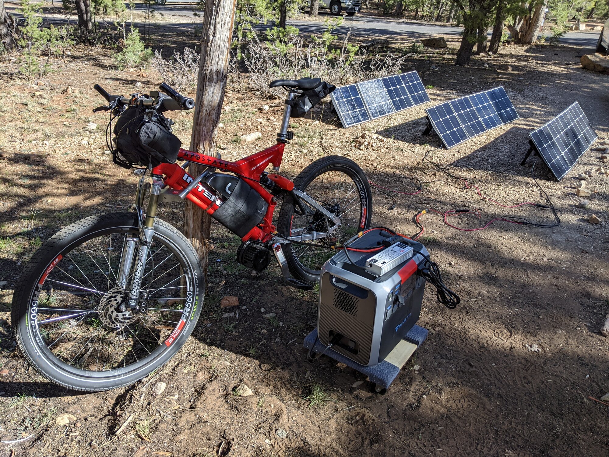 I was tent camping there for the week (last day there it snowed a little; nights were cold and I had to let the sun be up for a bit to ensure I charged above freezing temps). No plug-in electricity. So how do you do an ebike when there is no 'e'?