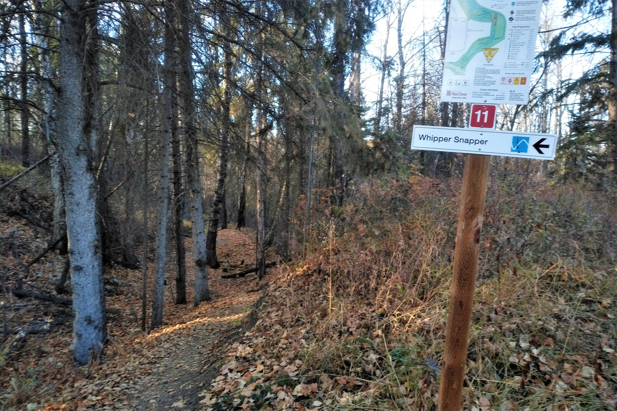I’m still a bit sore and tired from my Banff outing but really want to milk these remaining fine days for all their worth. Then, as I was riding along the Pines singletrack which follows immediately after exiting the mtb park, I spotted a young mule deer along the side of the trail and noticed that it was acting strange. Normally, these creatures bolt anytime they sense someone coming. That’s when I noticed its left hind leg was broken at the heel and hanging on by just a few ligaments. I can only speculate that it might have been tagged by a passing car somewhere along the nearby roadside. Poor thing. It probably won’t survive the week.