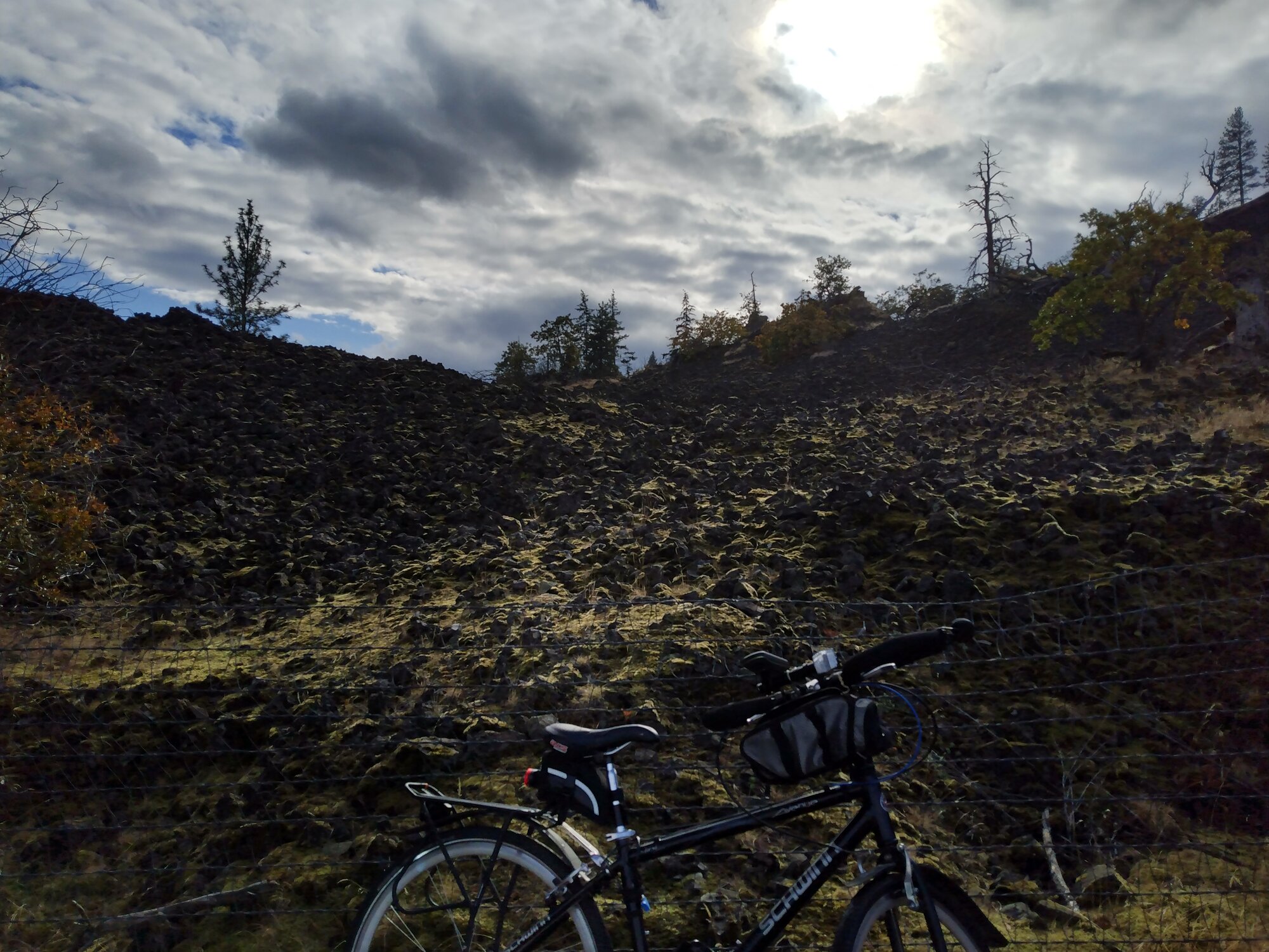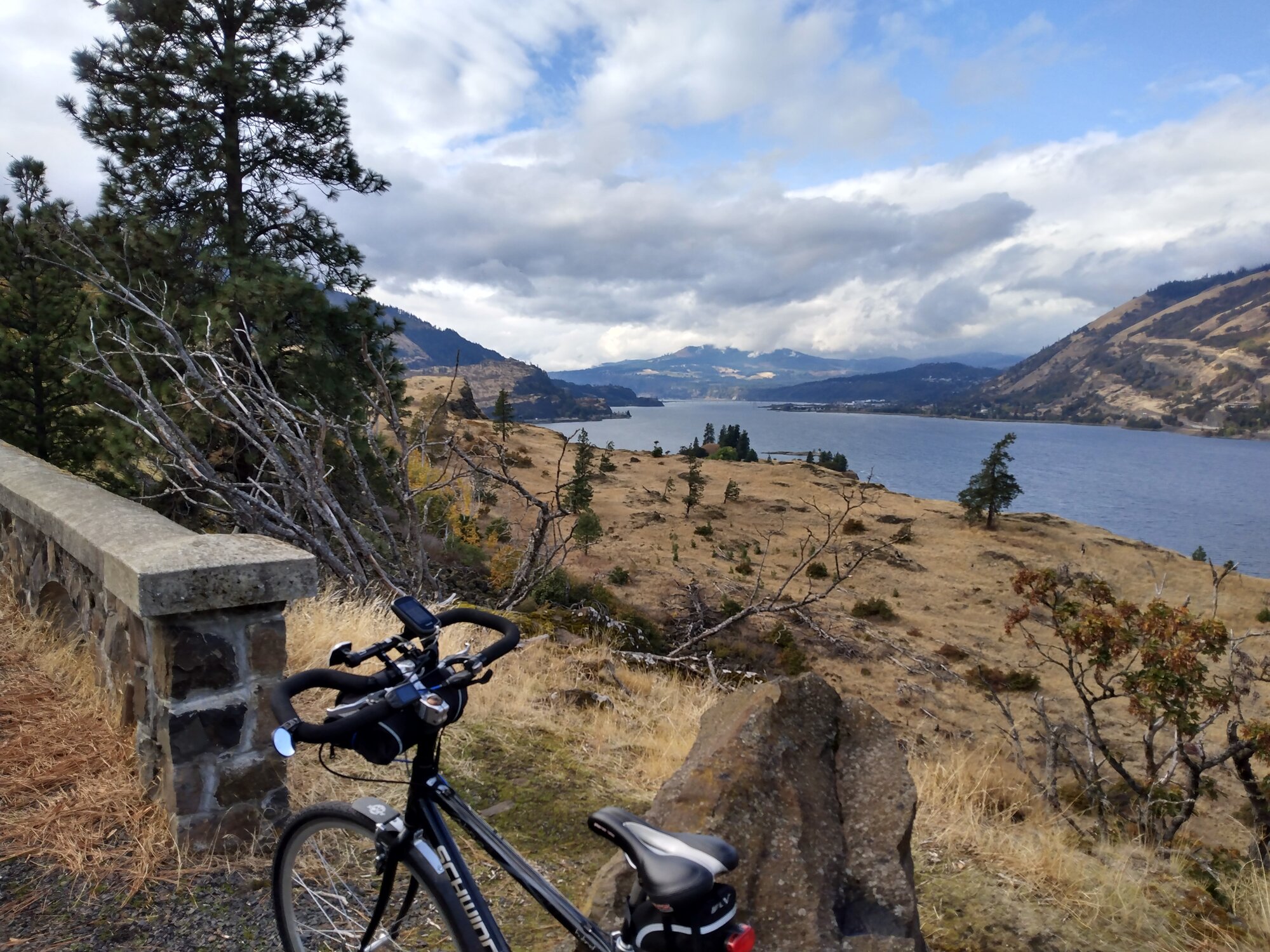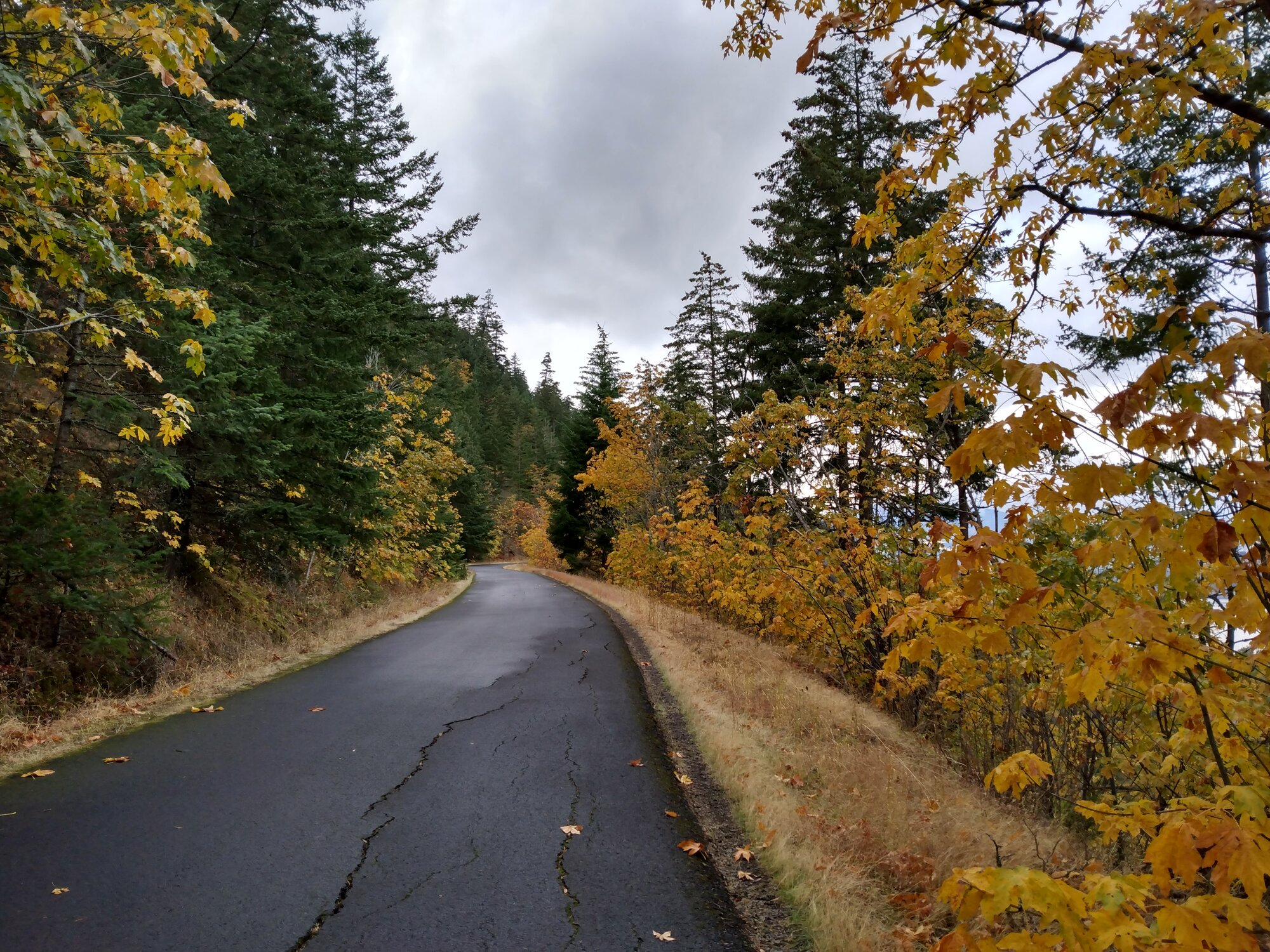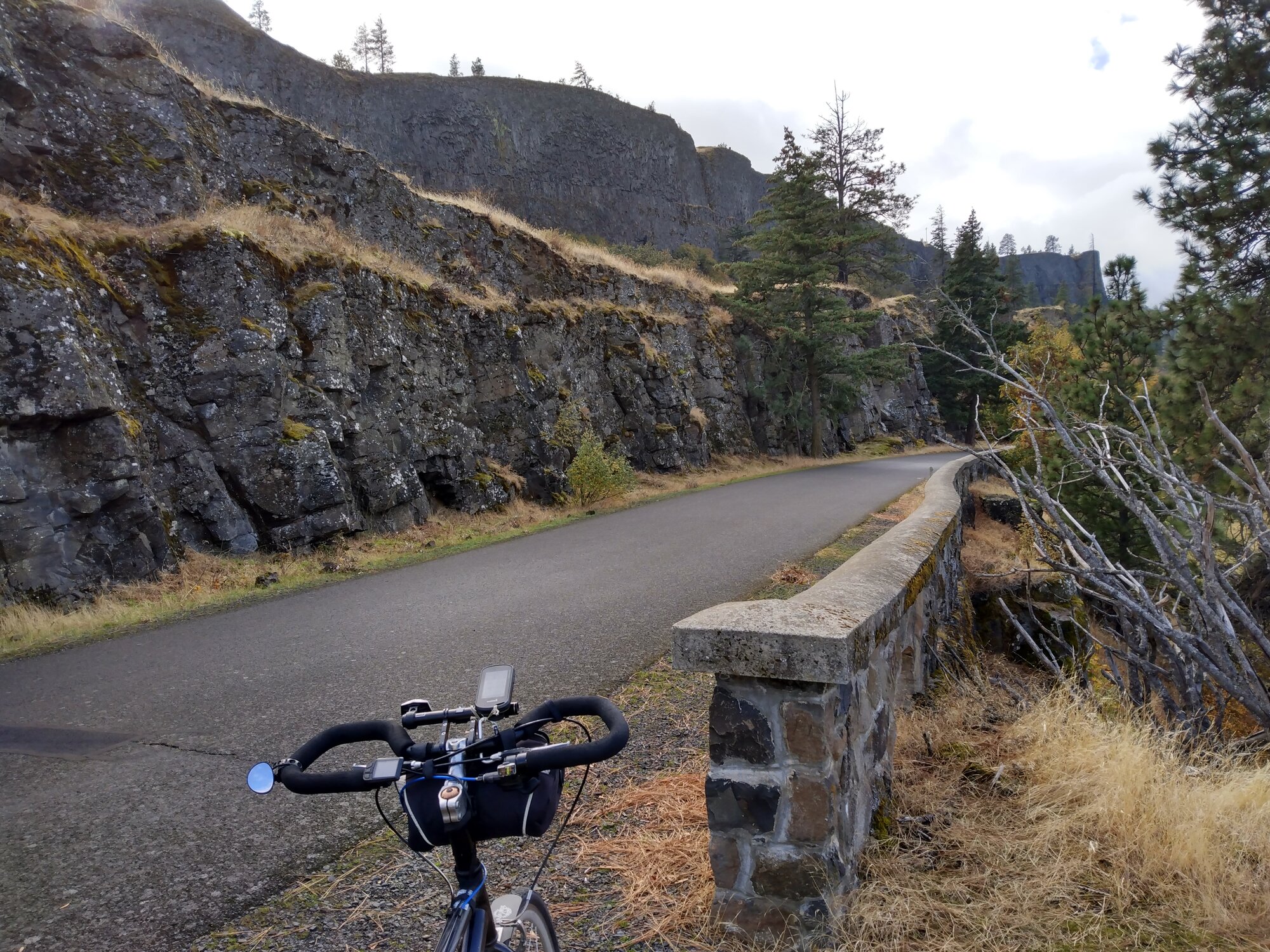 Along the Columbia river between Hood River and Mosier OR on a no cars segment of highway 30. I ride here often as rainy weather west of here usually stops around Hood River. Almost the entire 50 mile drive to get there was rain and dense fog.
