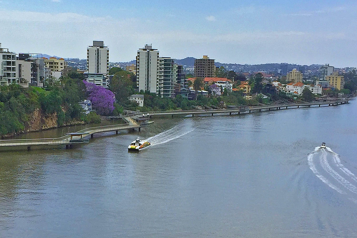 • Below: Looking downriver from the Story Bridge to where the first photo was taken (shelter about to be passed by CityCat ferry).