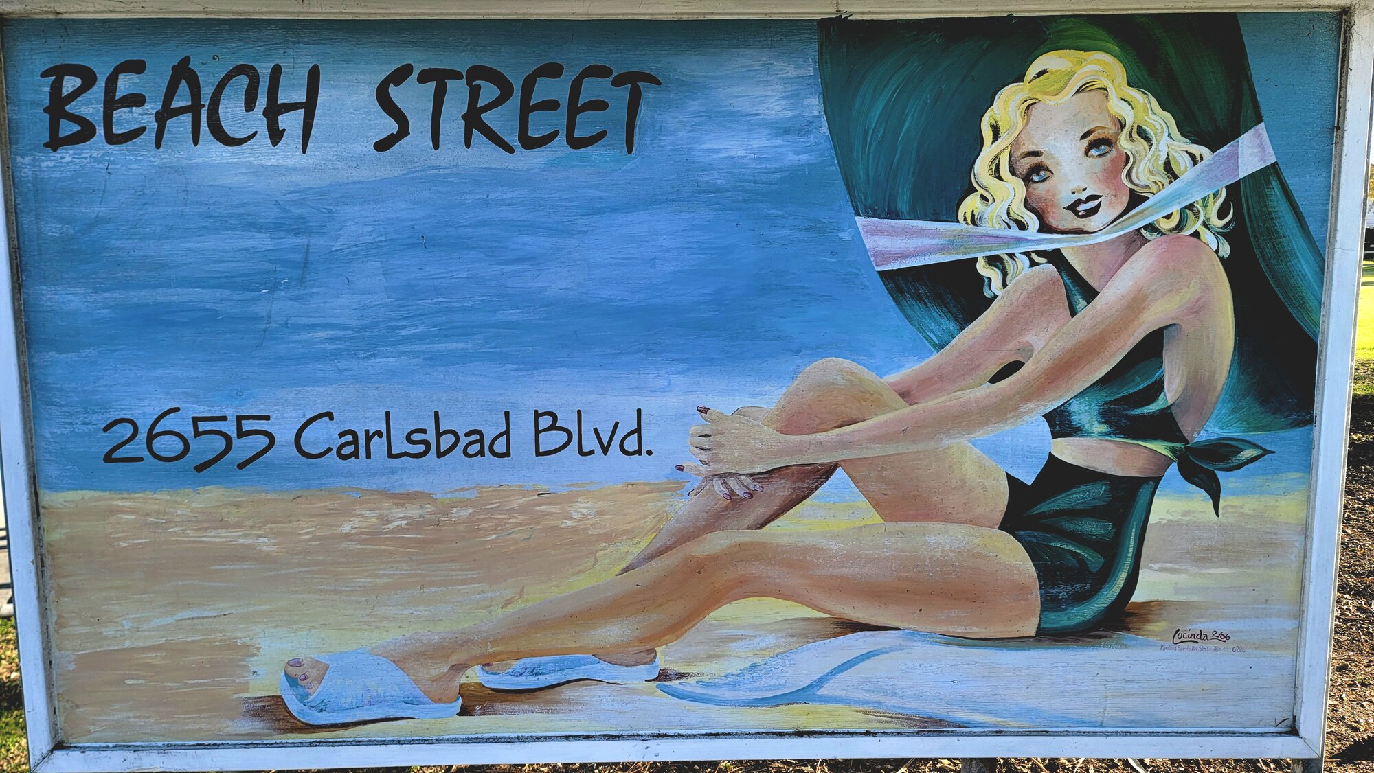 On the way back, we stopped to hang with the "Beach Street girl" — the one on this old hand-painted sign for a day spa named Beach Street in north Carlsbad. We decided she should have a name.