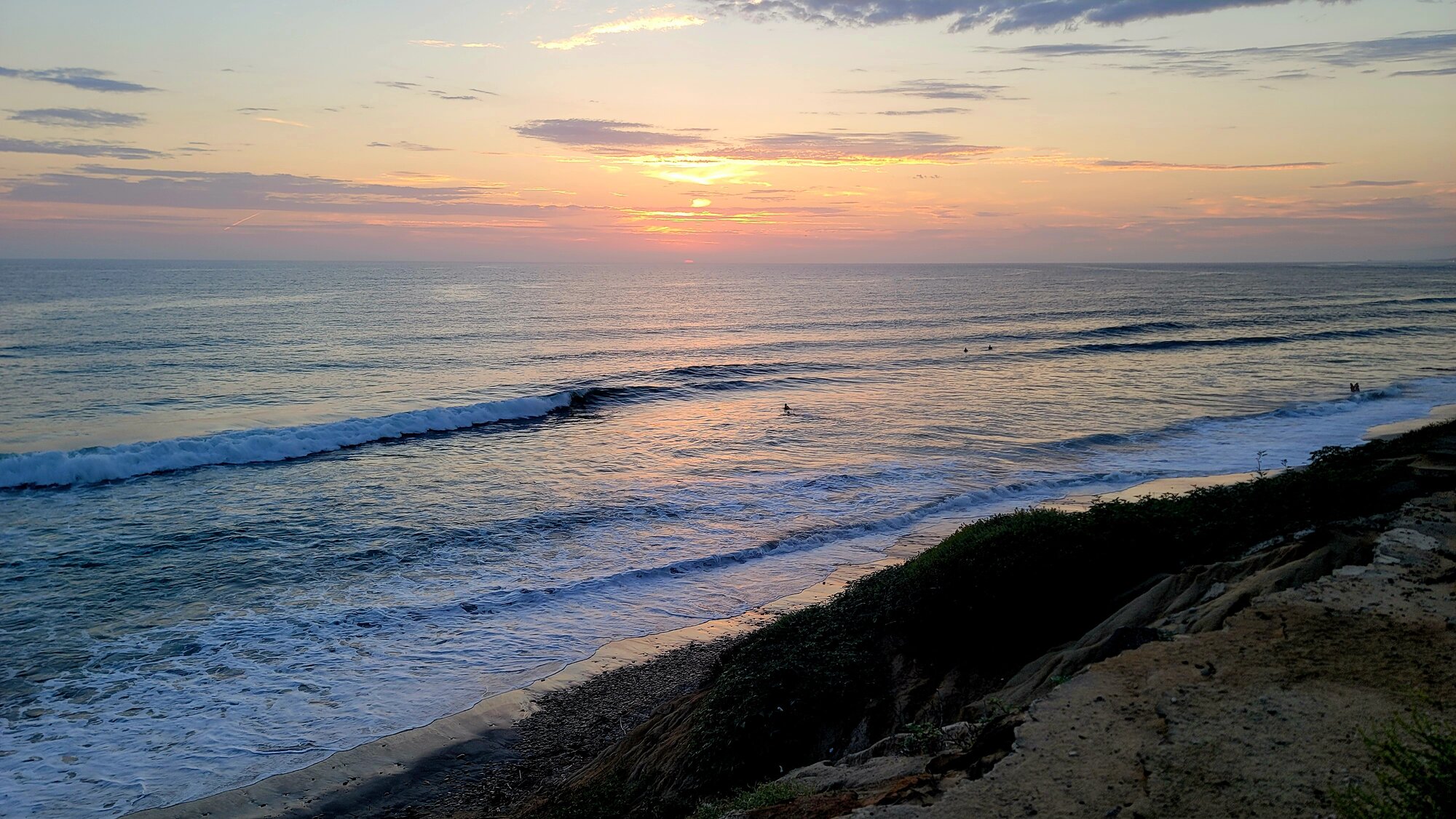 The sunset didn't disappoint, and neither did the water. With little wind chop, a near-glassy surface, and stately swell coming in from 2 slightly different directions, the ocean seemed almost serene.