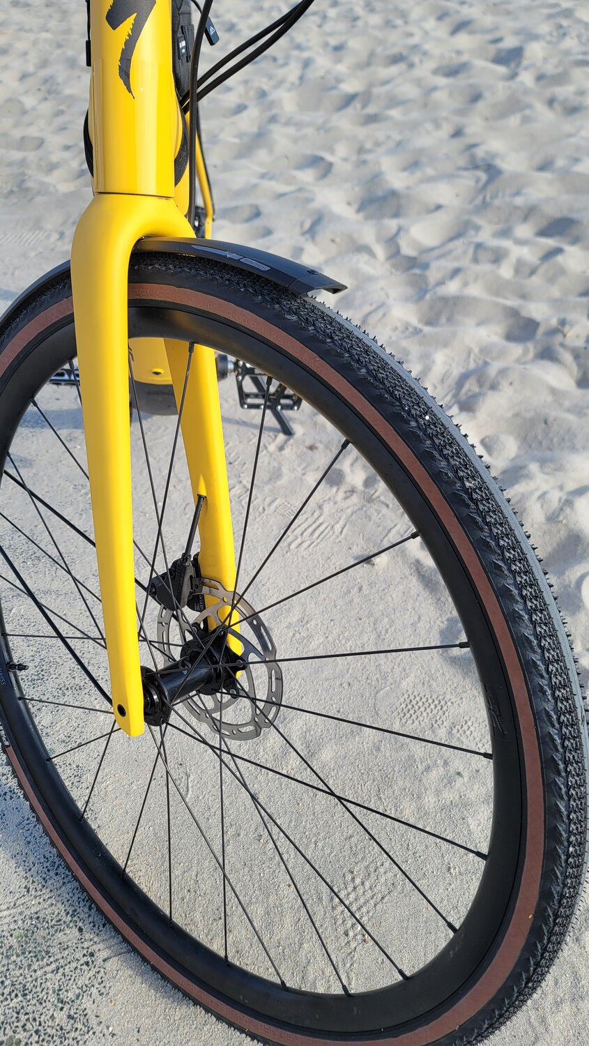 The offroad test involved ~6 mi of variably rutted and sand-covered packed dirt with stretches of deeper sand, embedded rocks, and loose coarse gravel. The new 38 mm Pathfinder Pro 2Bliss Ready tires passed with flying colors at 36 psi. Fast rolling on the paved stretches, too.