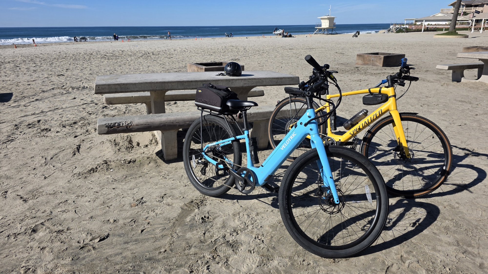 The rolling coast ride came first, with a tasty brunch stop for machaco tacos on the sand at Moonlight Beach. The blue Velotric Breeze is hers.