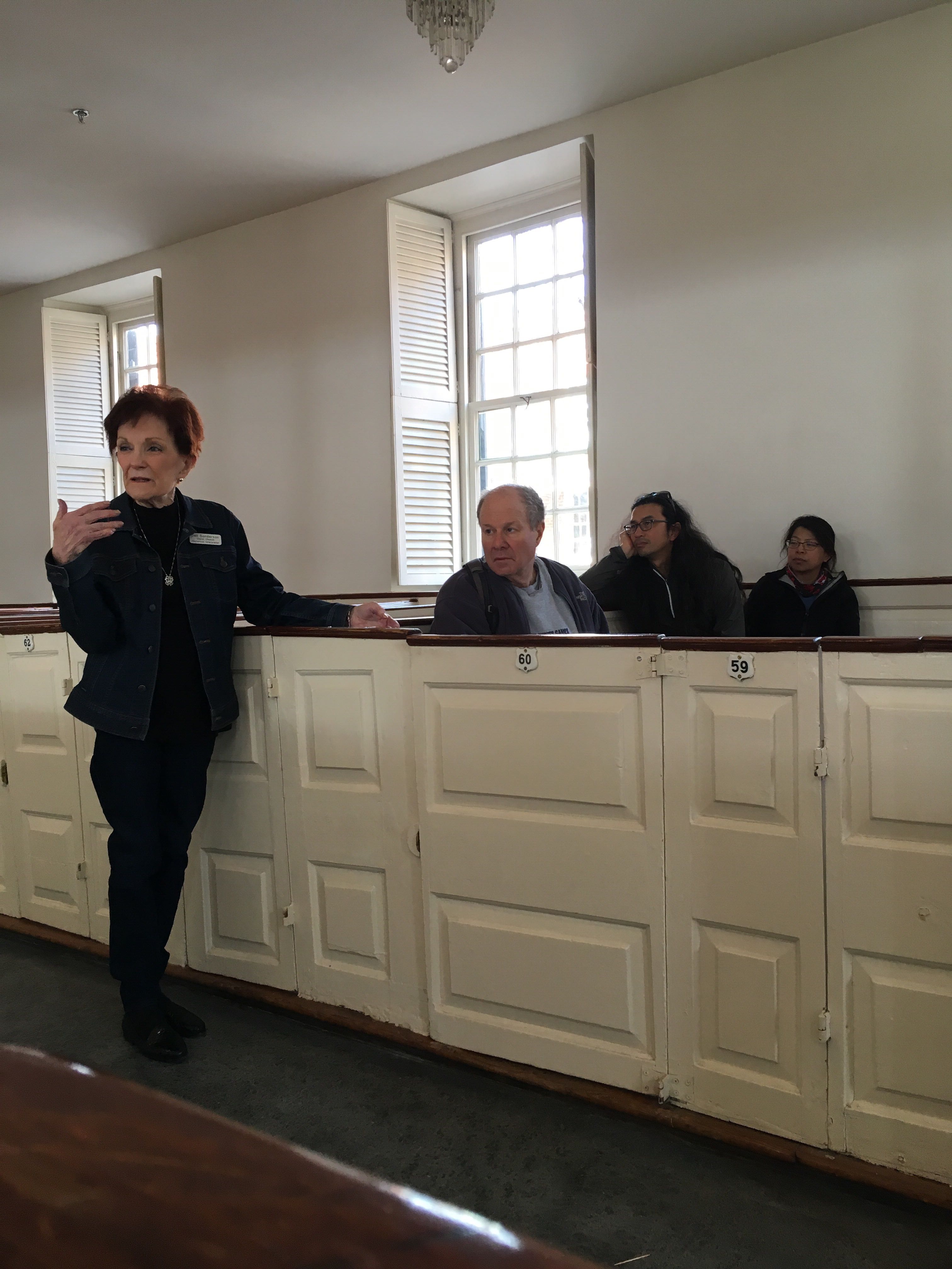 Our docent at the Christ Church stop, standing next to the Washington pew.