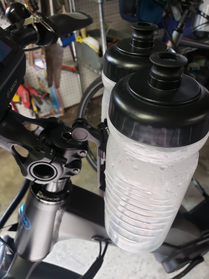 I drink more water if I have it close to me on the handlebar and can access it at a red light...I hope this will help reduce those nasty leg cramps that surprise attack me in the evening after long rides.