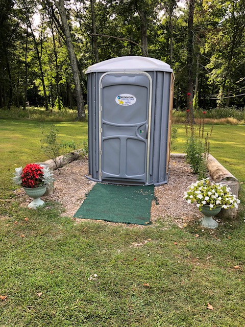 It looks like a gravesite. When you REALLY gotta go, ya gotta go.Marji and I took a 40 mile round trip ride to Roseland Park in Woodstock, CT to see a local art show. The park was nice as was some of the art. The best though was the high class outhouse.
