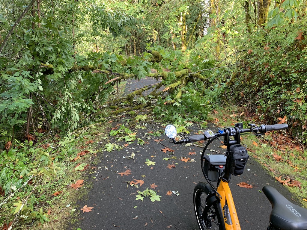 The ride from Banks to Vernonia in the morning was not without its obstacles. Had to go under the first and over the second. Two hours later on my way back, both obstacles had been cleared from the trail and it was smooth sailing.