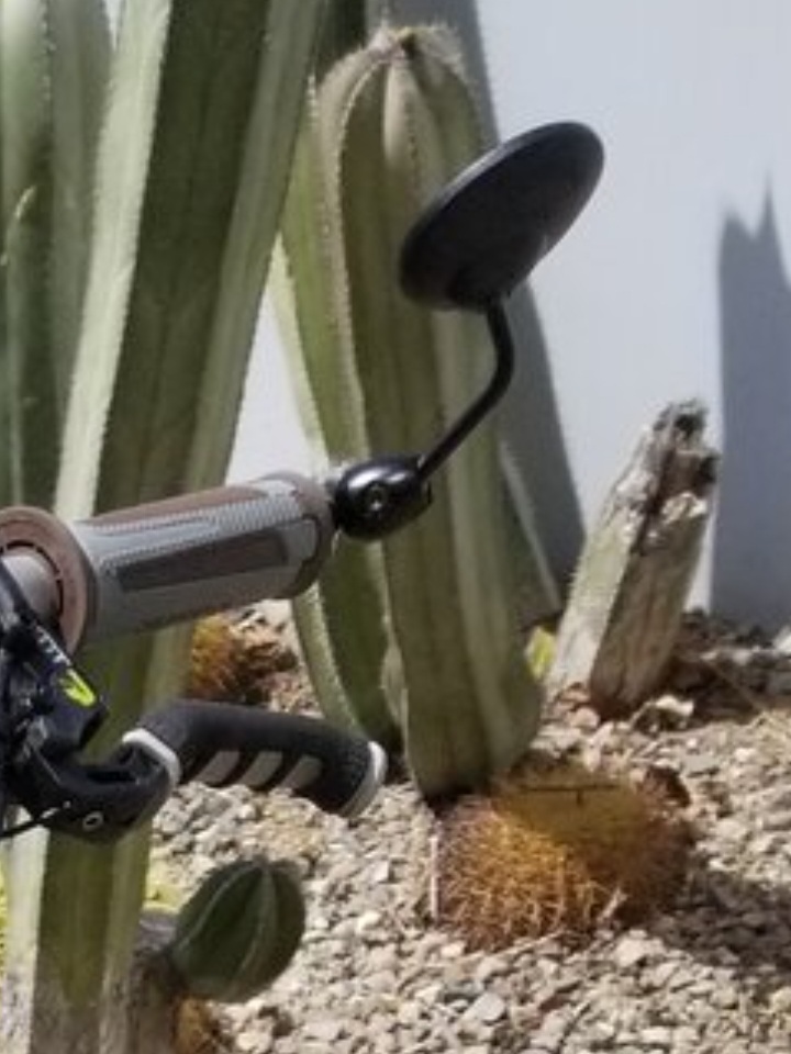 A small, minimalist mirror, the bar-end placement extends it outward over 70mm past the 700mm for a more complete view around my body. Measure from saddle center line (385mm) outward for reference.