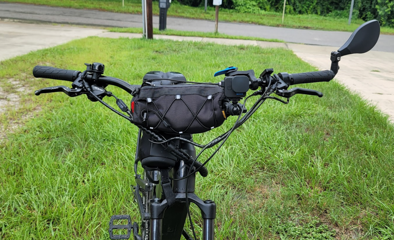 The battery for the GoPro (bought it used) doesn't charge fully anymore, and there's no easy way to replace this one. I have a USB Y cable so it's powering both the GoPro and the GPS. I generally don't ride in bad weather so I'm not worried about the door being open on the GoPro. Although I did get caught in a thunderstorm today and had to camp out until it was done. Still a drizzle to get home.