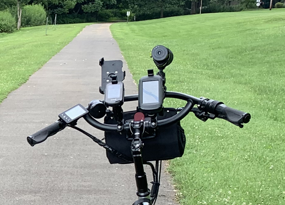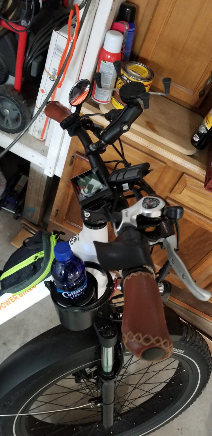 Two are GPS receivers. One displays the ride stats with big numbers I can read with my old eyes and the other displays a rolling map large enough to read details while navigating. The ride details are saved & downloaded to my desktop. The third screen is the bike display set to show speed, PAS level & battery gauge. The fourth is a smartphone (out of it's mount & being used to take the pic). I use the ESB app on the smartphone to display battery voltage, % charge and remaining distance on the current charge. The screens on all the devices are programmable and able to show a variety of stats.