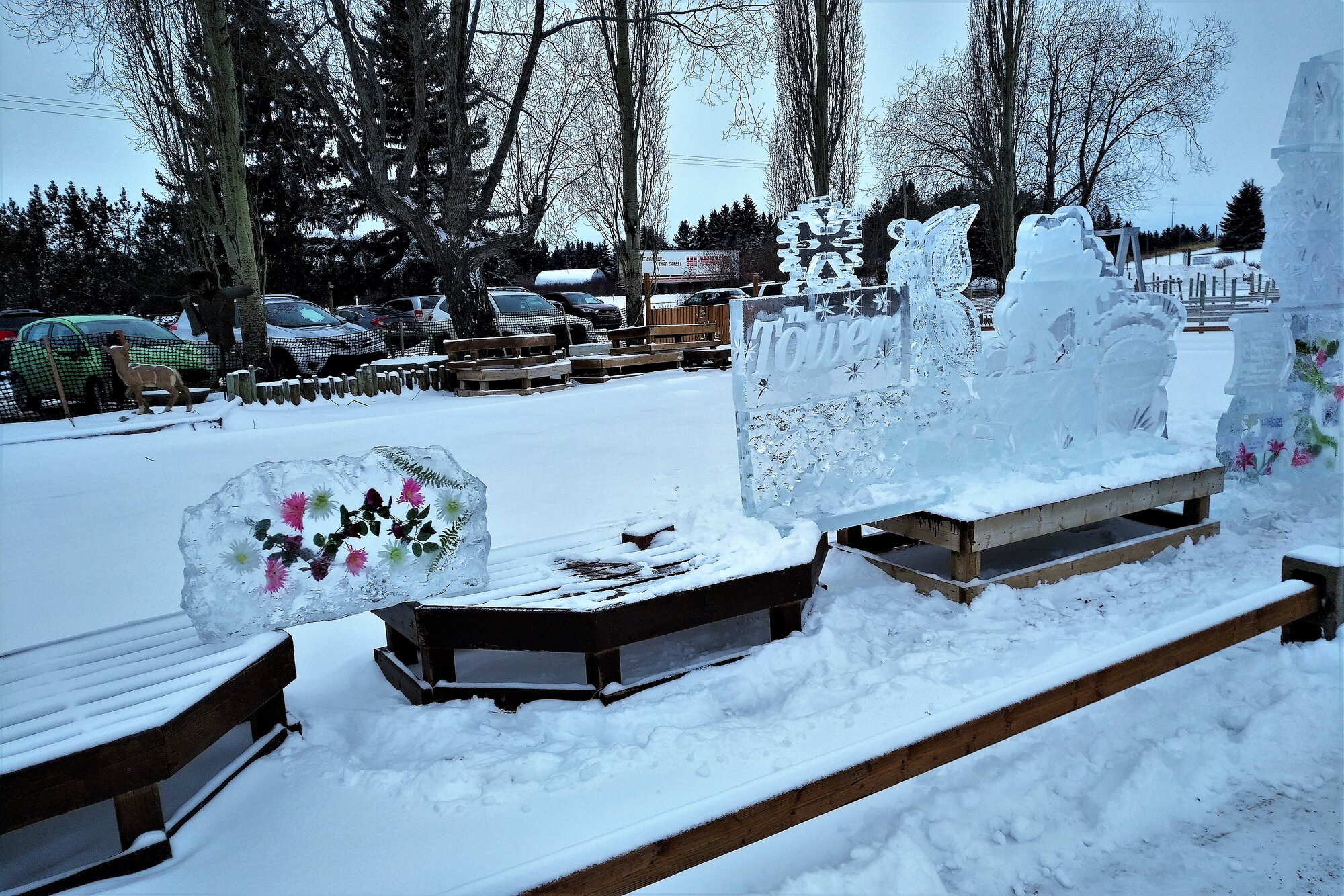 The garden center is only 8km from home but I thought that the display had already been completed once I arrived on scene. Turns out this was only the second day that the fellow was working on it. I’ll have to return once he’s done, maybe at night when it's back lit. It was -15C on yesterday’s ride which was a great temperature for carving ice. This has to be at least the 8th or 9th season that he's been carving ice at this location.That ice sculpting and etching looks amazing!