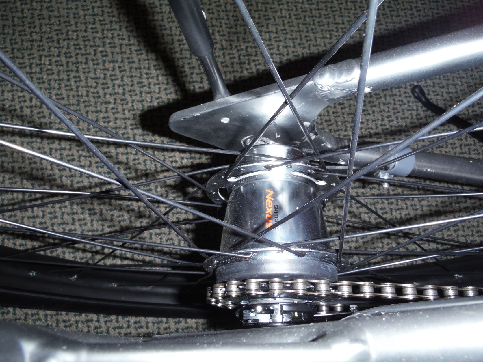 This 'ride' has a seven-speeds with a coaster brake. I did it with through frame wiring. Next I will drop the Nexus cog from 22-t to 16, giving it a 25% boost in top-end speed. It is weird and one of a kind. Zoom to count the wires on the HB.