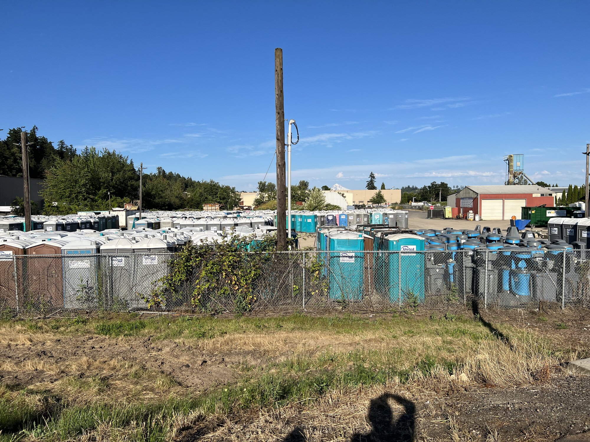 Here we see after getting chased by the dog is the porta potty primeval forest. with toilet roll birds flittering from porta potty to porta potty.