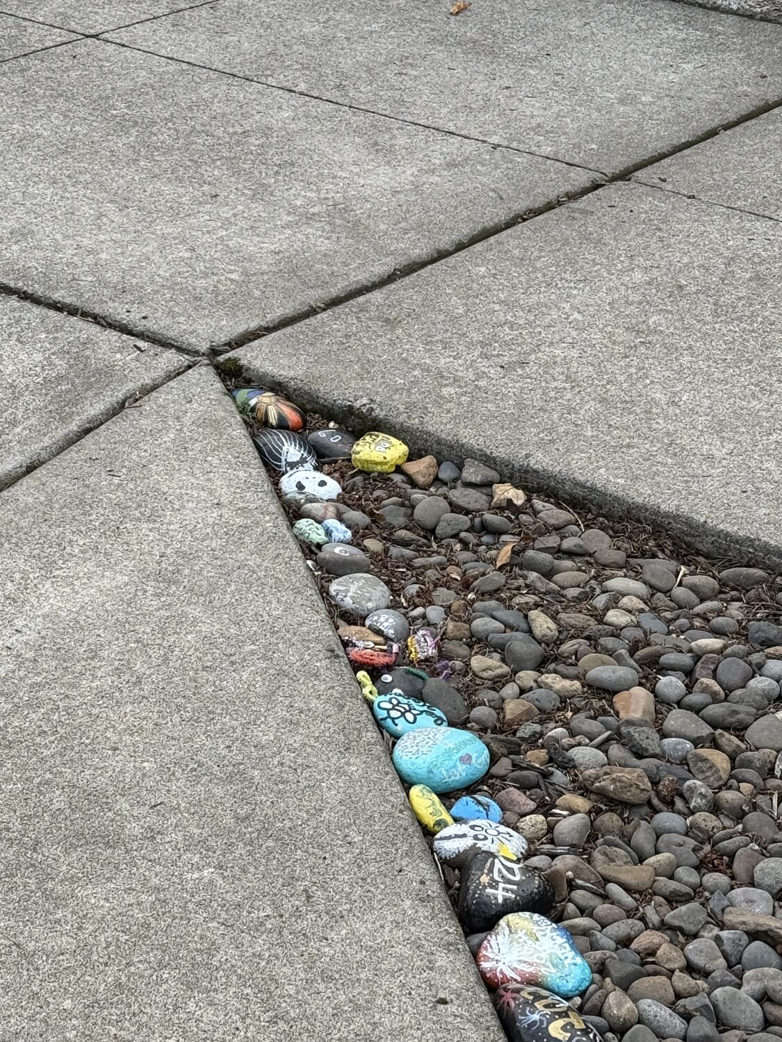 These little paintings are a public artform unto themselves and often bring a smile. Most are cheery with bight colors. Any messages tend to be positive or uplifting. Some are quite clever. Some were painted by talented artists, some by very young kids.