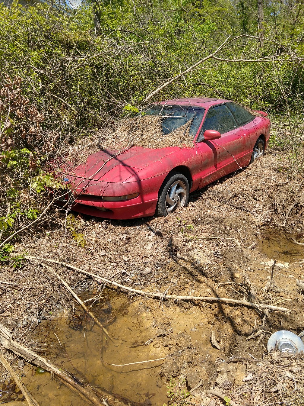 That is a Ford Probe...my wife had one.Seen on my Mother's Day ride yesterday (detailed on another thread). A local property had been sold and the house razed and the overgrowth bulldozed, uncovering this relic that had sat for so long in this spot that trees had grown up surrounding it. I got as close as I could to take a picture without risking a slip into the big rainwater puddles filled with masses of disgusting wriggling mosquito larve, but unable to get closer to see what model Ford this was other than to see the GT on the (?) rocker panel.