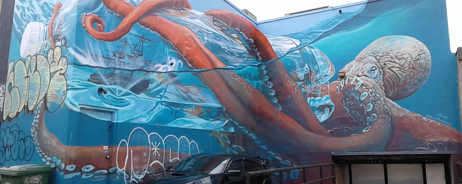 This Octopus is holding a plastic bottle with a ship in it. Something feels ironic. I assume the graffiti is the work of other somewhat less talented "artists".