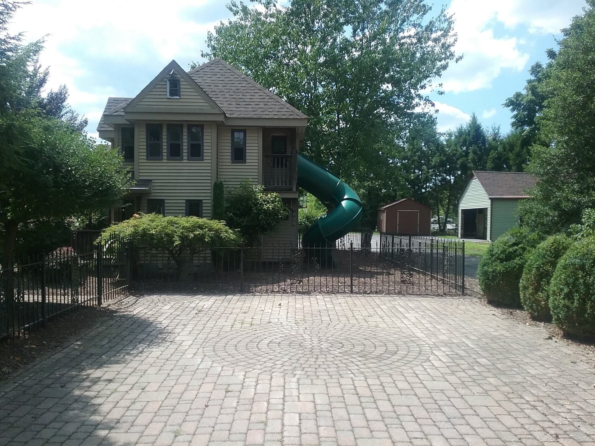 Wow! That is amazing! Someone is very creative.This looks like a house ... it's not ... it's a playhouse that matches the main house ... notice the greenish blue tube from the upper "floor" to the ground ... that's a slide. The whole thing is maybe 20 foot tall.
