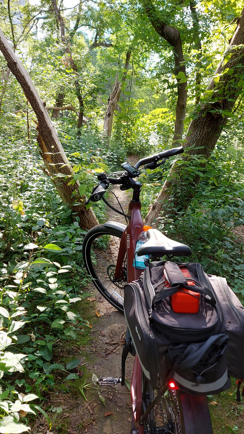 Nice bike!Explored a previously unknown side trail on my new OHM Cruise yesterday, and found this split tree. I dubbed the trail "V for Victory". No poison ivy but the burrs meant some itching/burning until this morning, even with calamine lotion