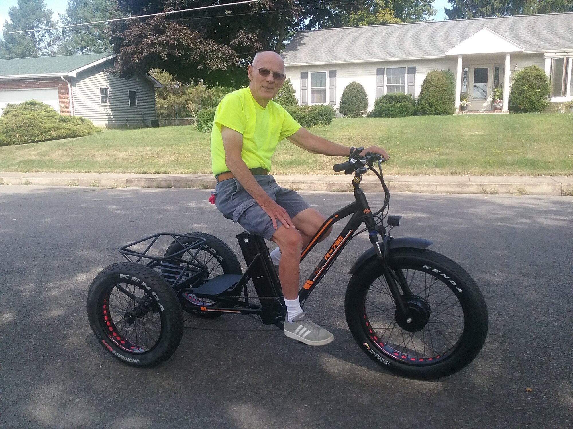 Today's ebike. The only ebike I've seen in the wild other than ours in our tiny town. The rider is my neighbor, an experienced cyclist. The trike is new, under 20 miles on it, and he is testing it for a friend with health issues. He says it's like an old muscle car, goes fast, stops straight, and doesn't handle corners at all.View attachment 63090