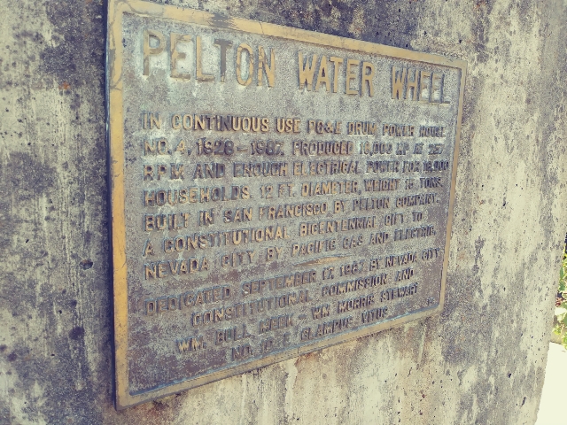 The Pelton wheel was invented by Lester Pelton not far from here in the 1870's and patented in 1880. Due to its high efficiency Pelton's design quickly replaced earlier lower efficiency water driven turbine designs and then steam engines that powered lifts in the local hard rock gold mines. At its design speed a Pelton wheel would extract neatly all of the energy from a focused steam of high pressure water. Originally manufactured at the local Miner's Foundry here in Nevada City, CA, production moved to San Francisco as demand increased.