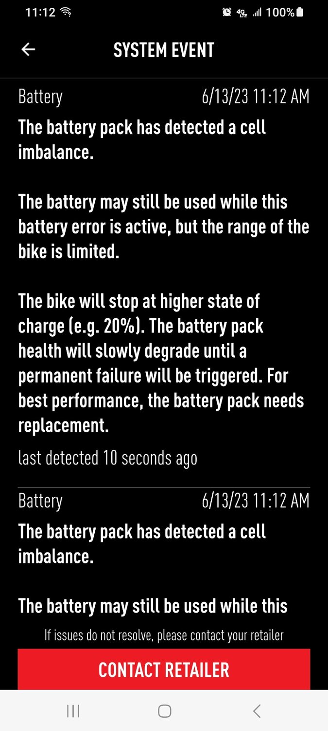 For my 3 year old Turbo Creo SL I am getting an error message on Mission Control that says "The battery pack has detected a cell imbalance" and that "The bike will stop at higher state of charge (20%)" and that "The battery pack will slowly degrade until a permanent failure will be triggered." Also, when charging, the charging stops at 78%, so that I cannot charge to anything higher than 78%. Attached is screenshot of the Mission Control error message.