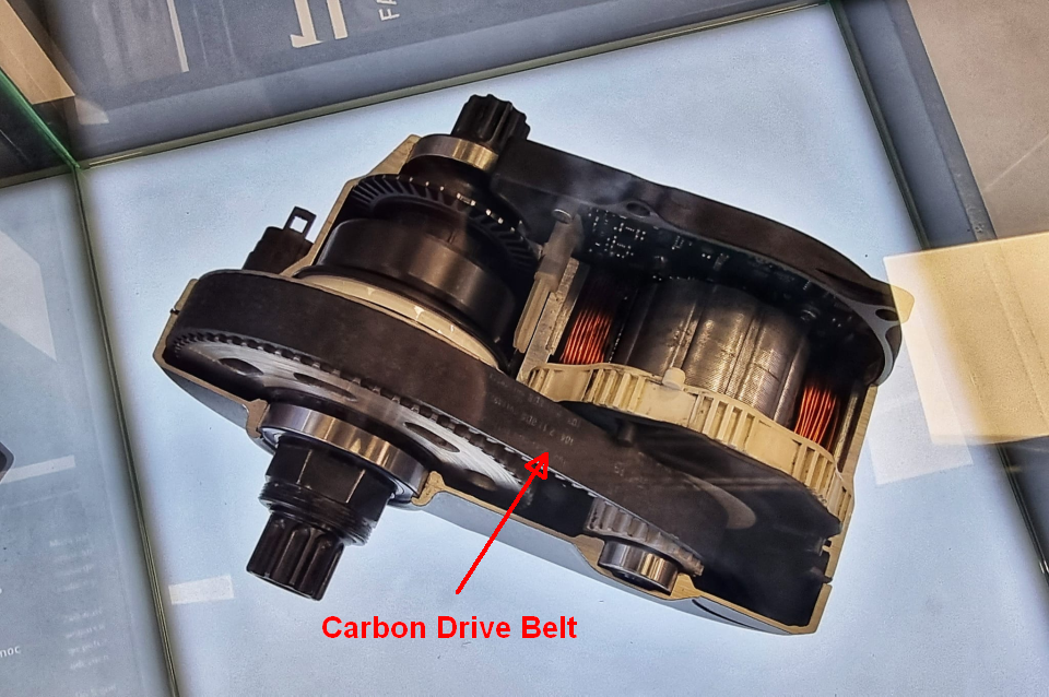 Once the carbon fibre belt gets worn (everything gets eventually worn), it will break, making the motor useless. Yes, it is possible to find the appropriate belt and replace it. However, replacing the whole motor is simpler, and that's what is typically done. (Photo taken in Specialized Warsaw: an exhibit motor).
