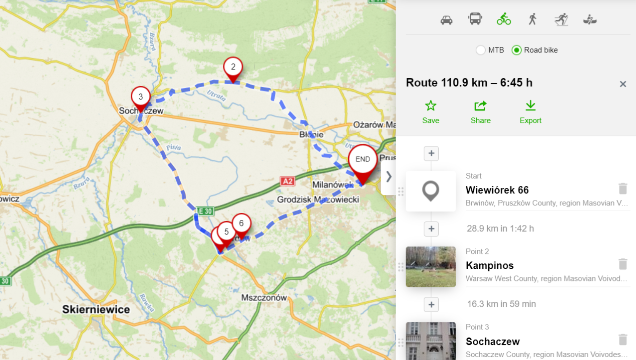 My goal is to be able to make a 100+ km (62+ mi) round trip to Sochaczew via Kampinos then return way via Żyrardów. Not that Sochaczew is an interesting city because it is actually boring but it is a good goal because of the distance ;) With my current range, that would require two batteries and riding in the Eco mode.