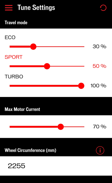 The settings. My Vado supported me too much in the Eco (35%) and in the Sport (70%) modes. Also, the Max Motor Current (Peak Power) set to 100% might be too much. I am dedicated to increase the battery range at the cost of performance. The Wheel Circumference was wrong for my bike. The Electrak 2.0 tyres are 51-622 and the wheel circumference is 2274 mm. The original value reports lower speed than the actual and shorter distance covered than it actually is.