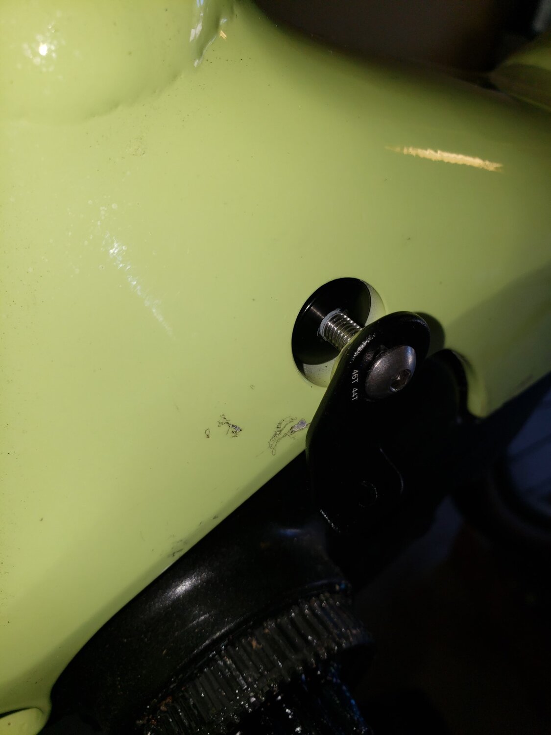 I installed the Creo SL Chain Guide today on my Vado SL. The Vado SL's motor mounting bolt hole is recessed too deep for the chain guide to simply bolt on as the guide is larger than the hole and the frame doesn't have a flat surface either. I had two nylon spacers laying around and they were a perfect fit for making a standoff to mount the bracket. The space between the chainring backside and the guide is maybe 2mm at best which should stop a dropped chain from lodging down between the frame and the chainring. I might tweak the top of the guide down a tad for a closer fit but I'm going to wait a bit to see if that's necessary.