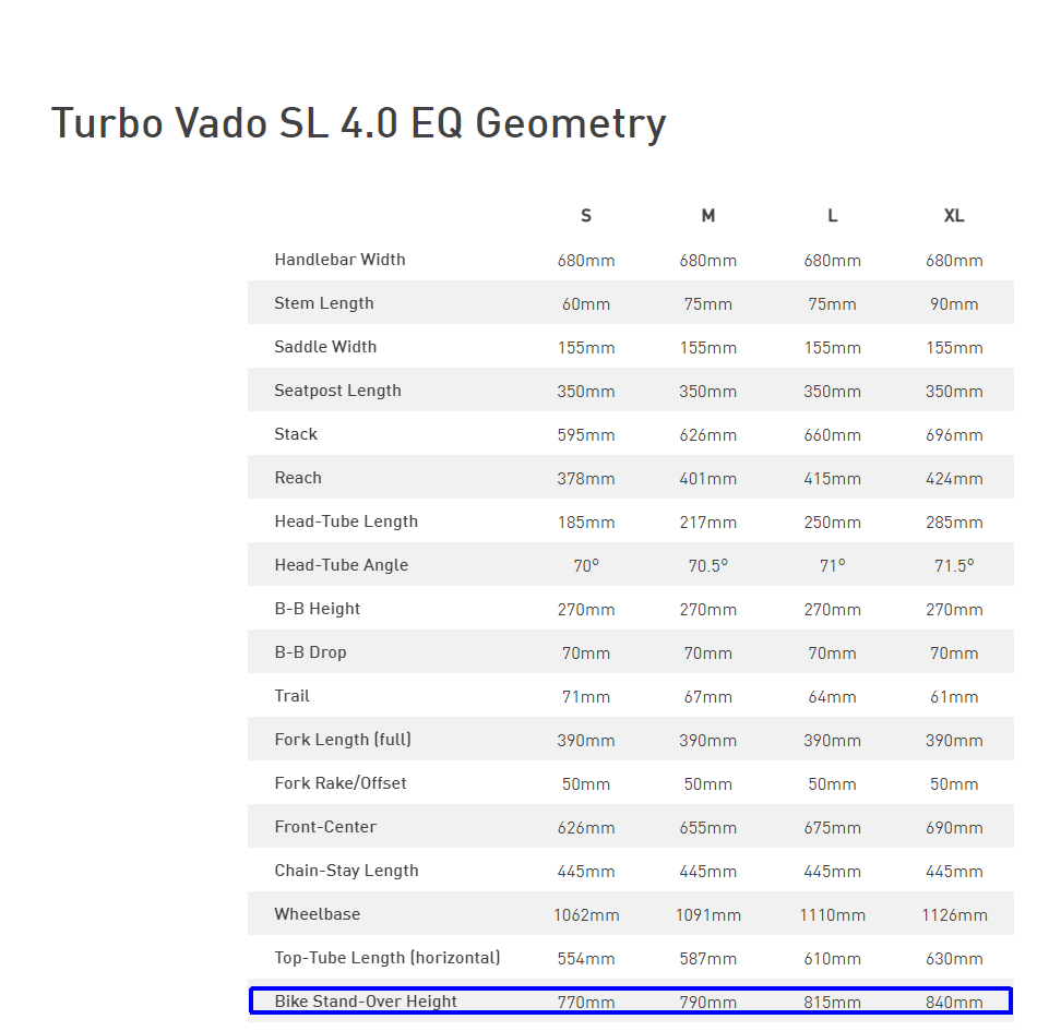 It's all very interesting, guys! Very! Because indeed all carbon fibre Creos have the Stand-Over Height figures far lower than they are for the E5. (I even didn't consider looking at the specs because of the price of CF e-bikes). (Allan: You do