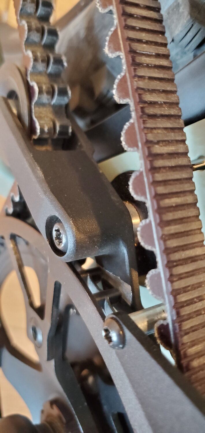 Mine is the same, maybe 1-2 mm clearance. Is it possible to take a picture from above showing the backside of the spider and the shaft where it enters the motor? I measured from the edge of the belt to the frame at the spot in the photo and it is exactly 10 mm. Can you measure yours?3) Tensioner and chainring, notice also, how close the chainring guard is to the tensioner pivot.