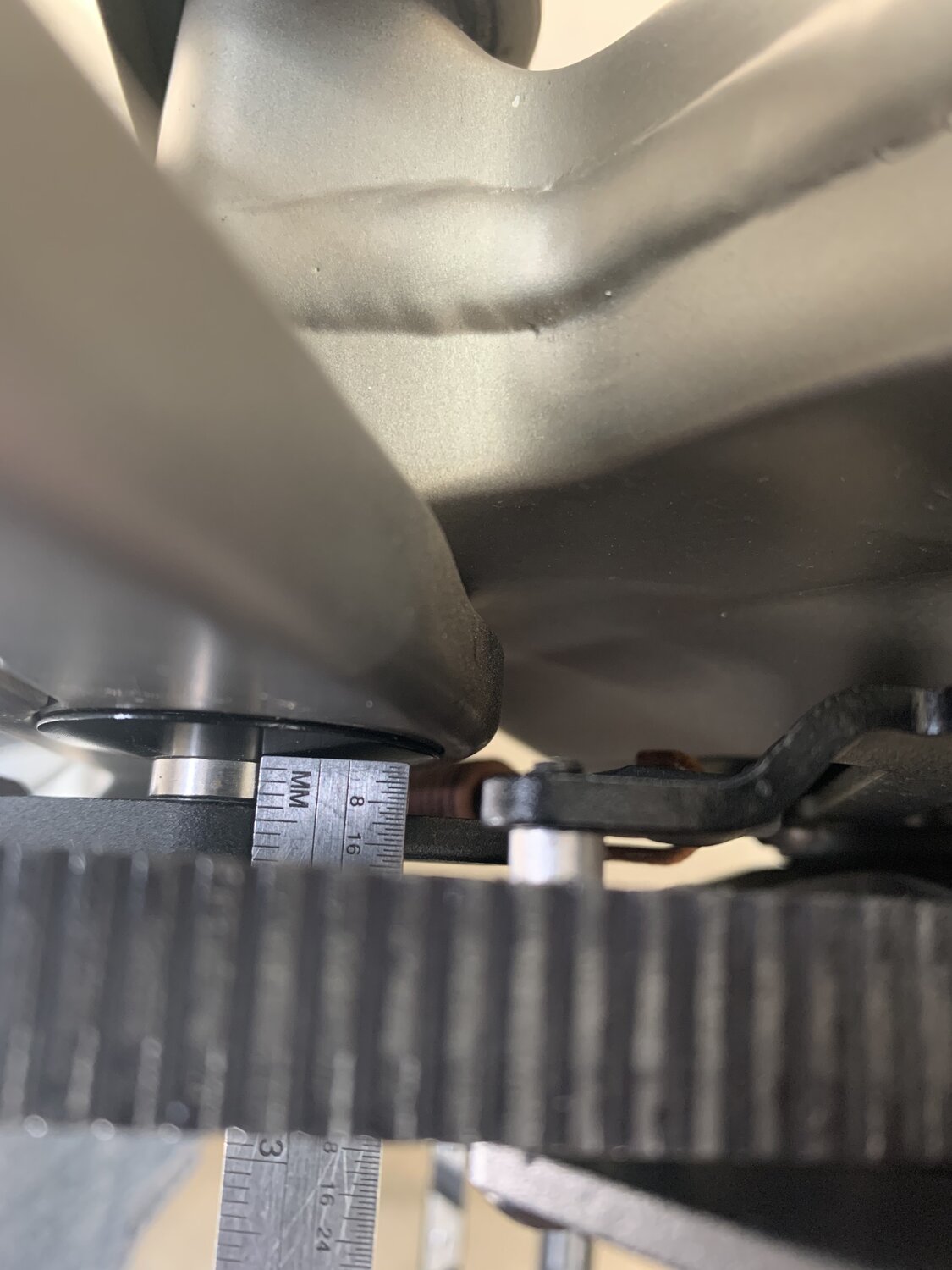 Here's that angle, mine is also about 10mm from the frame.Mine is the same, maybe 1-2 mm clearance. Is it possible to take a picture from above showing the backside of the spider and the shaft where it enters the motor? I measured from the edge of the belt to the frame at the spot in the photo and it is exactly 10 mm. Can you measure yours?