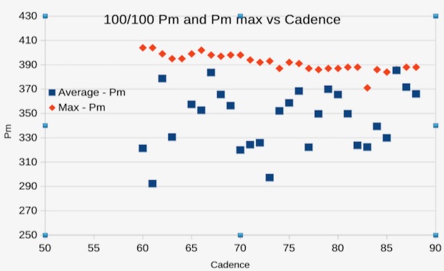 @mschwett , you were asking about Pmax at 80 cadence. Here's a chart from my 100/100 segment that shows the average and maximum Pm recorded per cadence.