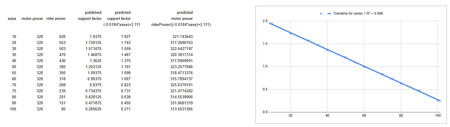 going back to the data, if you consider support factor as the inverse - rider power / motor power, it's actually linear. a very simple first degree equation can go from ease and rider power to motor power - motorPower = (riderPower/(-0.0814*ease)+2.11)
