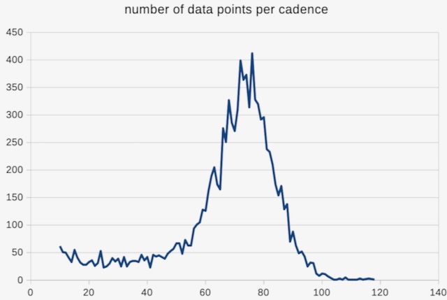 Here's how often a record occurred for a particular cadence. 0-10 have been deleted. (O was far and away the most prevalent cadence - coasting)