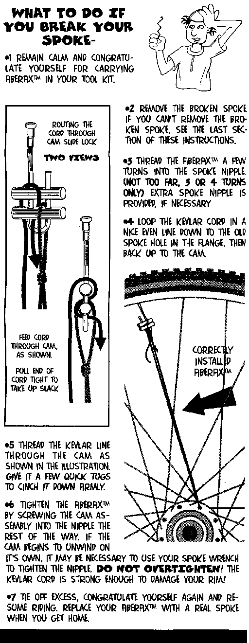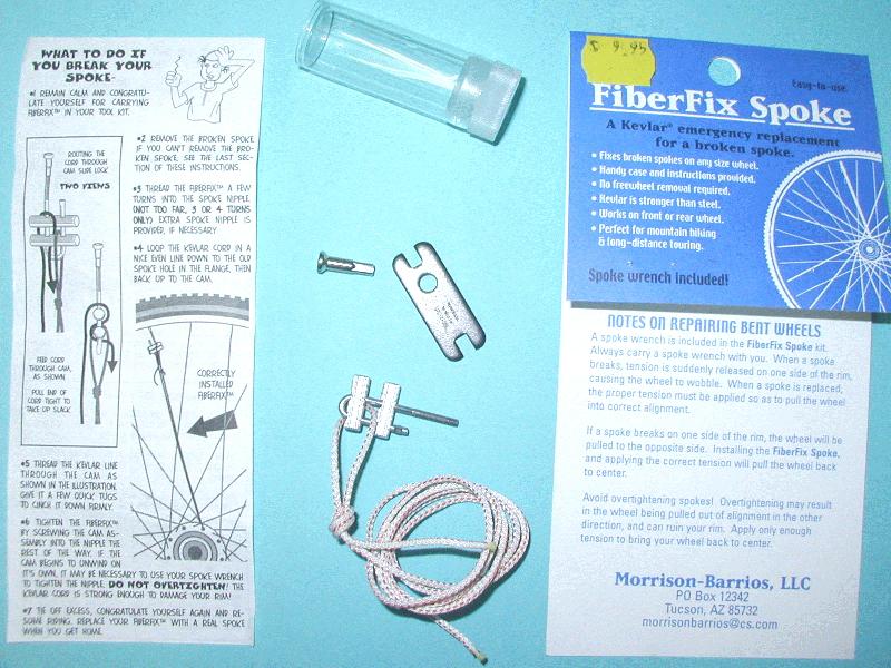 Manufactured by Morrison-Barrios LLC in Tucson, AZ, this very compact kit is a universal spoke replacement that has 5-star ratings just about everywhere it's sold. The FiberFix replacement spoke consists of a flexible aramid (Kevlar) cord that loops through the empty spoke hole in your hub and is then tensioned with the included hardware and tool to bring the wheel back into true. A spare spoke nipple is also included in the vial sized kit. Barring any serious abrasion where the cord passes through the hub, this kit should be reusable a number of times.