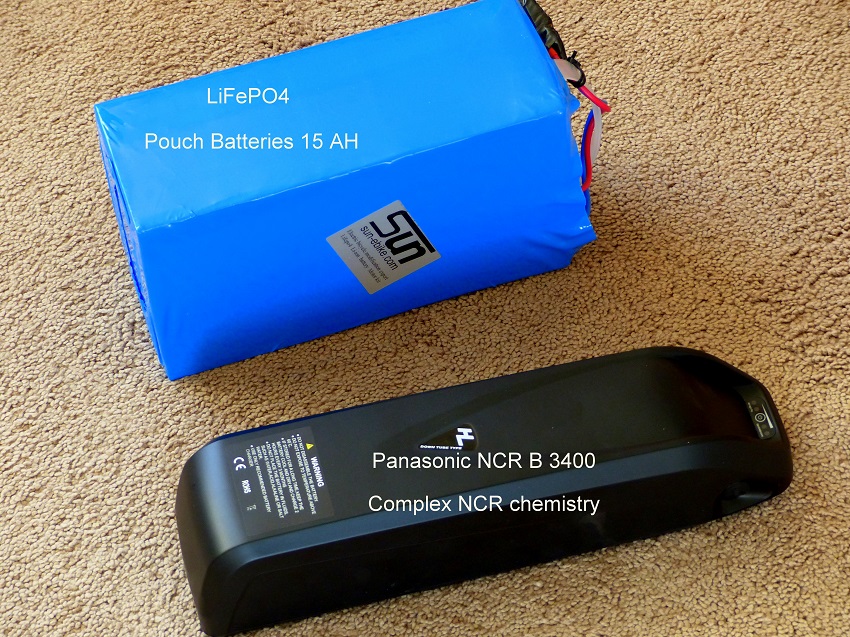 These are two different battery technologies. The Sun is a pouch type battery, using a different lithium chemistry LiFEPO4. Considered a little safer, but less energy per weight, so the batteries are bulkier and heavier. The other uses 18650 cells, maybe 52 of them for 48V, spot welded together. Both have battery management circuits for safety. Neither is a recognized brand, but Lunacycle does tell you who made the cells, usually Panasonic, Sanyo, or Samsung.