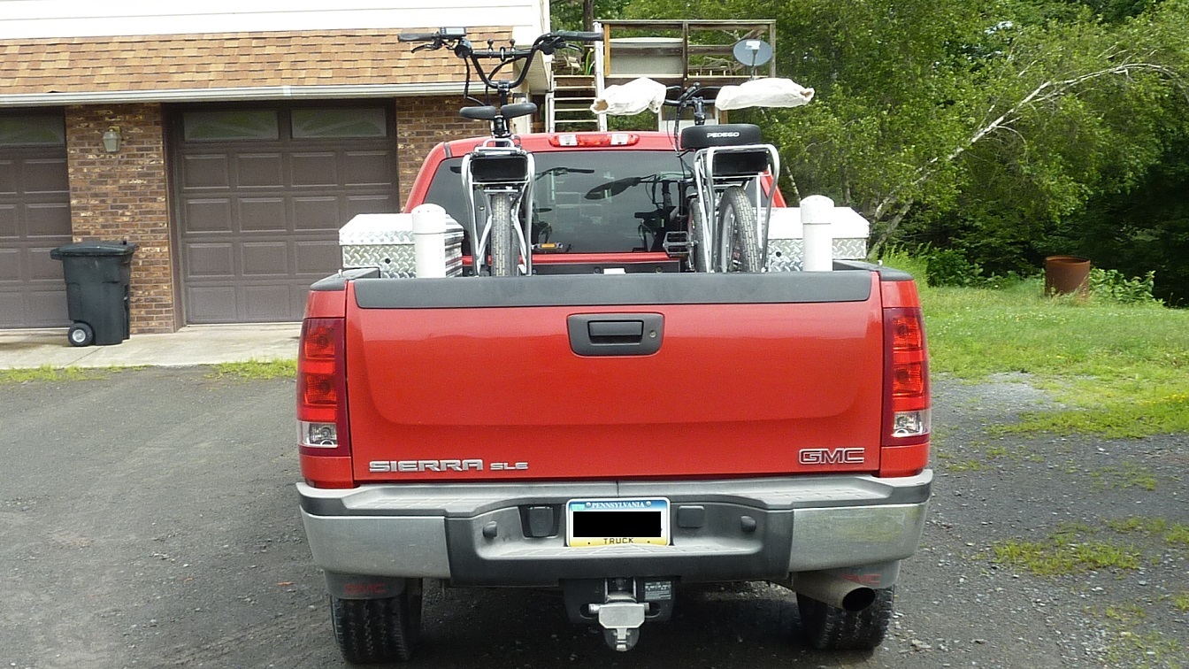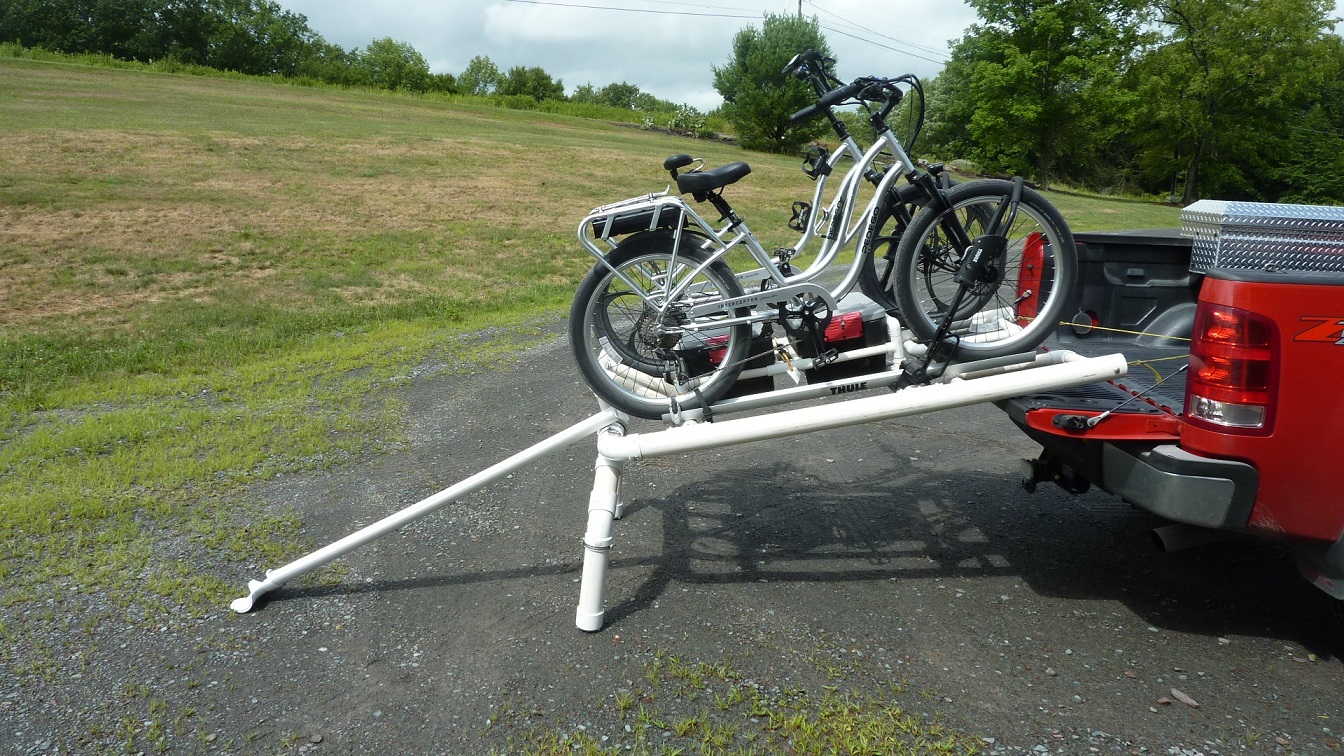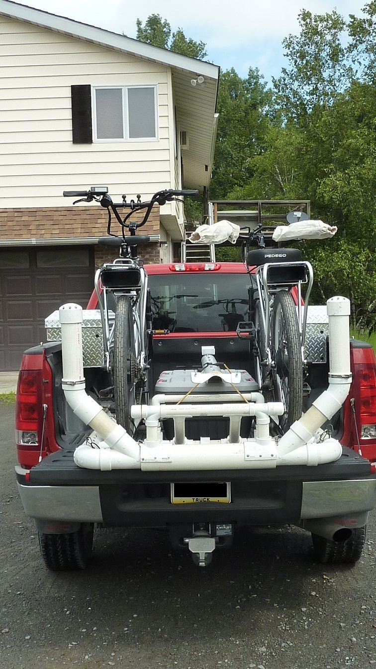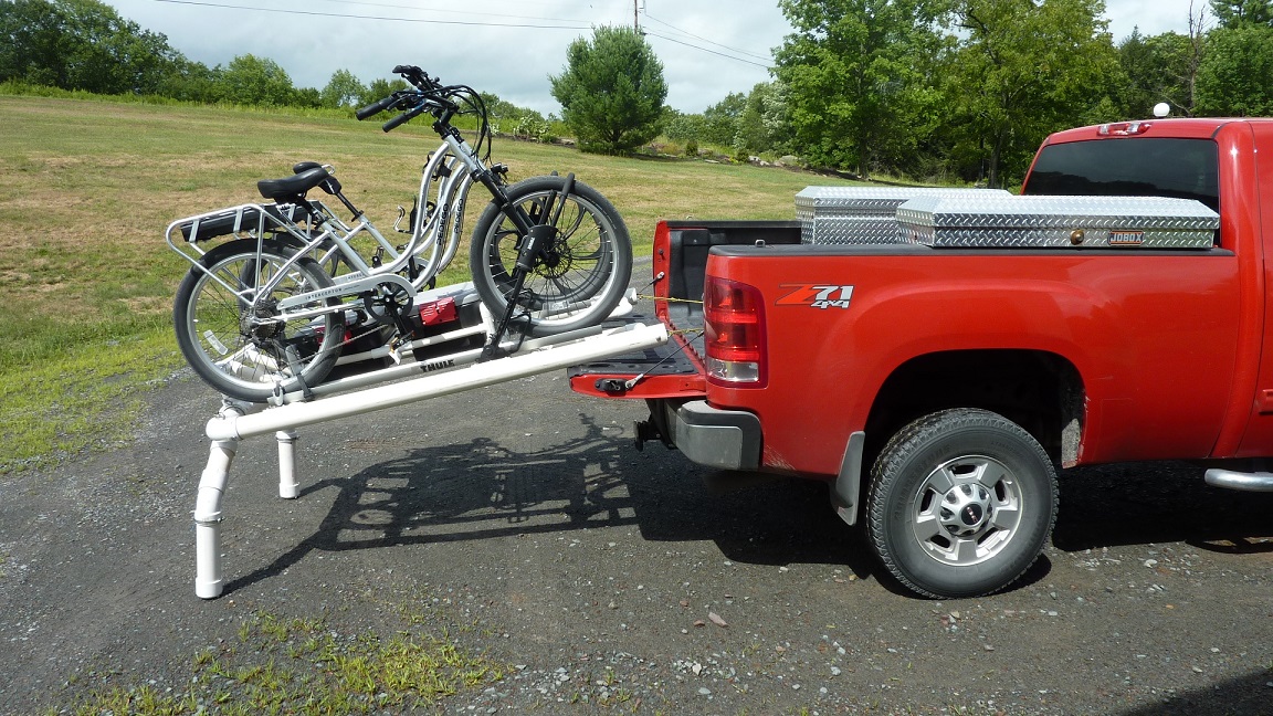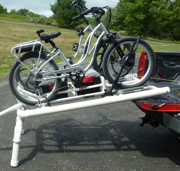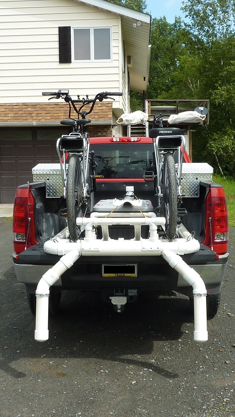 As a result, I built this platform out of PVC pipe that slides out making it easier to load. I use Thule roof racks to secure the bikes. The platform fits snugly into the pickup bed and requires no tie down at all. Due to it's nature, the PVC slides easily in and out of the bed with minimal effort.