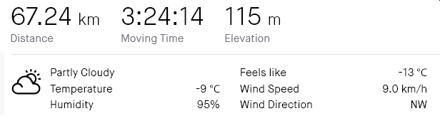 I once had a 67 km (41.6 mi) ride (with a stop at the friends' place at the farthest loop point) at -9 C (15.8 F) with the wind chill factor of -13 C (8.6 F).
