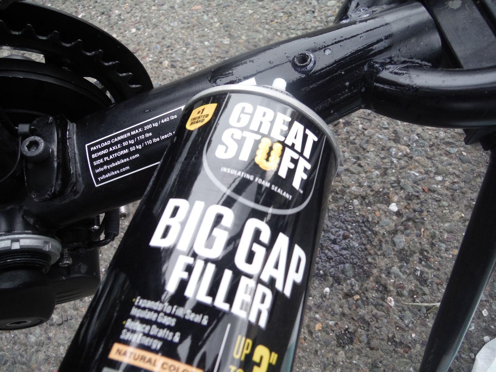 That was the first time I used Great Stuff to quiet a bike. I had on a brand new black cashmere sweater. I wreaked it. Great Stuff expanded out nearly invisible vent ports at the back of the bike and onto the rotor and chain. But it worked. The next time I did the prep and had on junky work cloths.