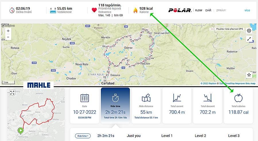 Example - Polar shows me 738 kcal and app. Mahle 30 cal. – Polar 1352 kcal app. Mahle 1,880.99 cal. (I will compare again, I had an older assignment of 1kg in Polar more).